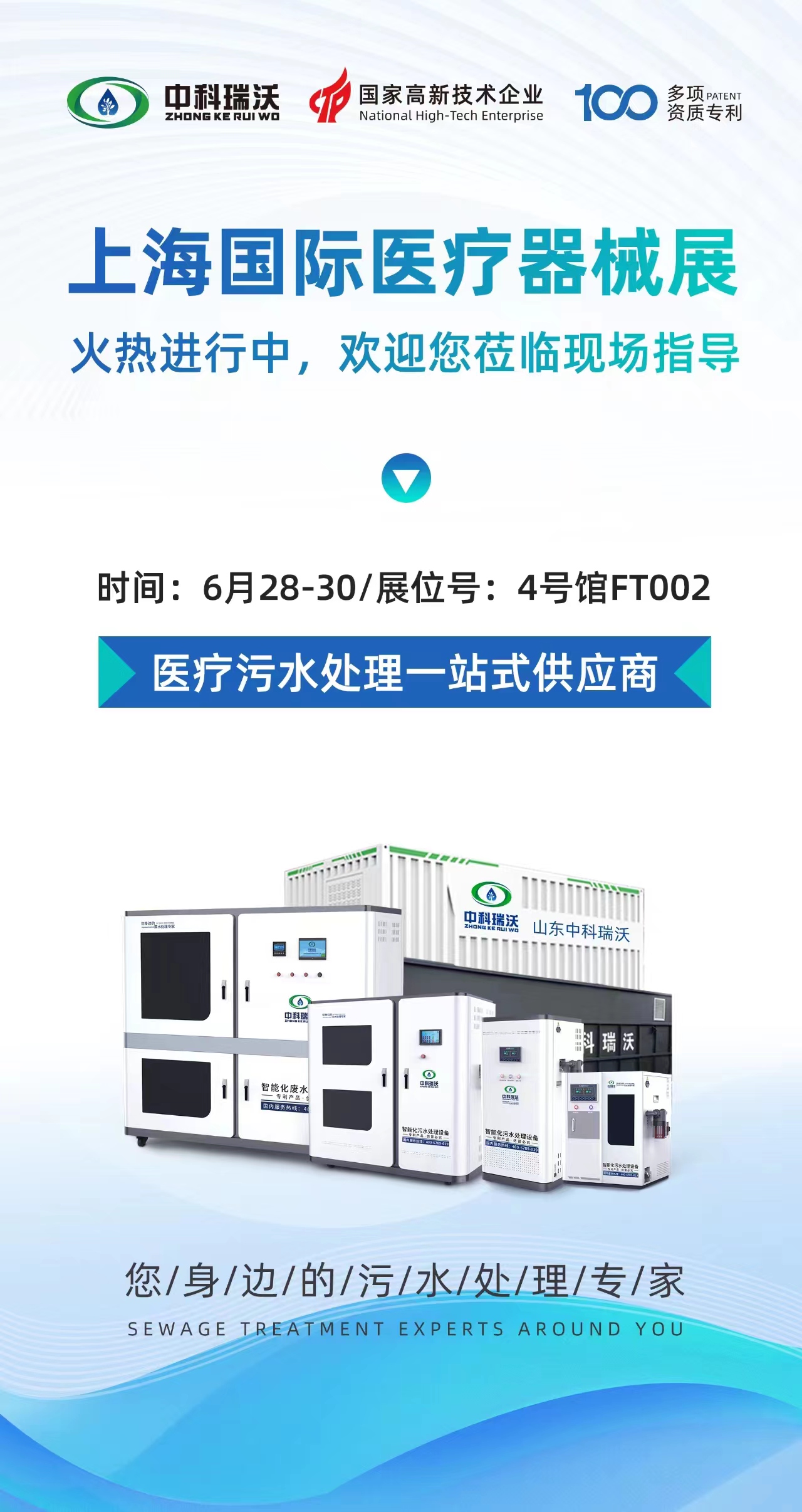 上海國(guó)際醫(yī)療器械展覽會(huì)將于6月28日-30日開(kāi)展,為期三天,誠(chéng)邀您蒞臨世博展覽館中科瑞沃FT002展位,我們將為您提供專業(yè)系統(tǒng)化的醫(yī)用污水解決方案!
